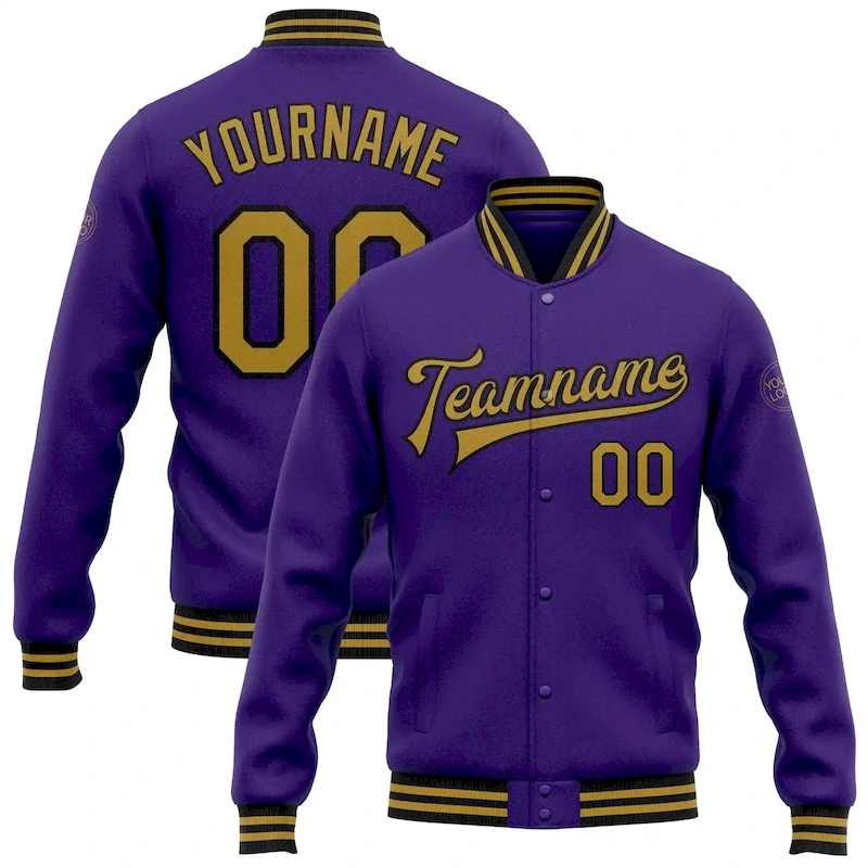 Custom Purple Old Gold-Black Bomber Full-Snap Varsity Letterman Jacket